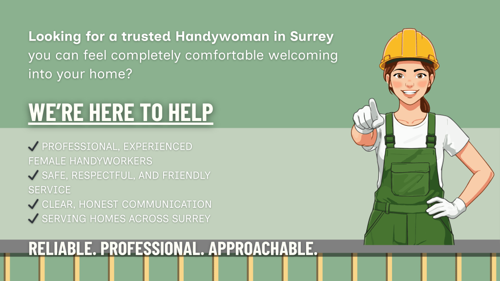 If you’d prefer not to have a male tradesperson in your home, you can hire one of our friendly, professional female handyworkers to help with everyday jobs around your house. We provide a safe, respectful service across Surrey, focusing on odd jobs and general home maintenance rather than full trade services. All work is carried out with a safety-first approach, and for clarity we do not undertake gas or electrical work.